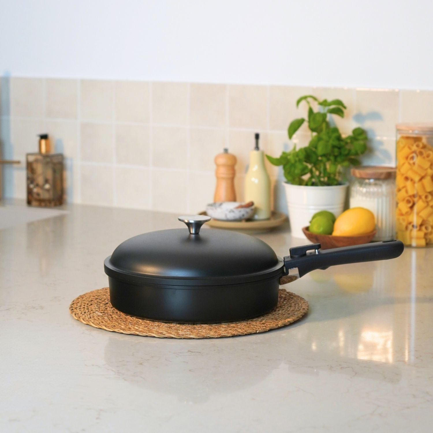 Ondersteunt tot 10 kg draagkracht en klikt met één beweging vast. Maakt elke pan geschikt voor kookplaat, oven, koelkast en tafel.
